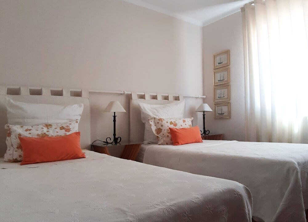 Unsere apartment im Ferienhaus in Sesimbra hat 3 Schlafzimmer, 6 Betten und 1 Duschbad. Auf der Galerie befindet sich noch ein Schlafsofa und ein Zugang zum eigenen Balkon mit Aussicht auf den schönen Garten mit Pool.